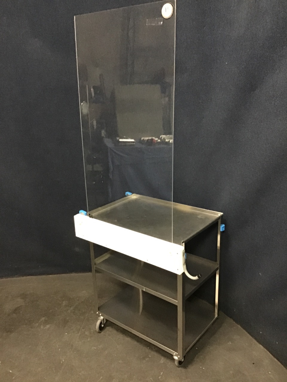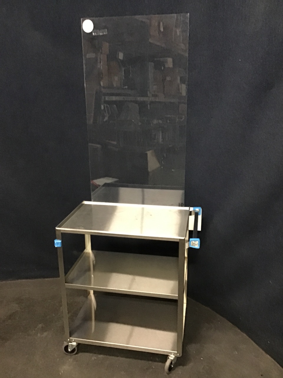 - 3 Shelf Stainless Cart: Modified with plexiglass shield for patient sign in. Height: 32 inches Width: 27 inches Length: 17 inches Weight: 20 lbs