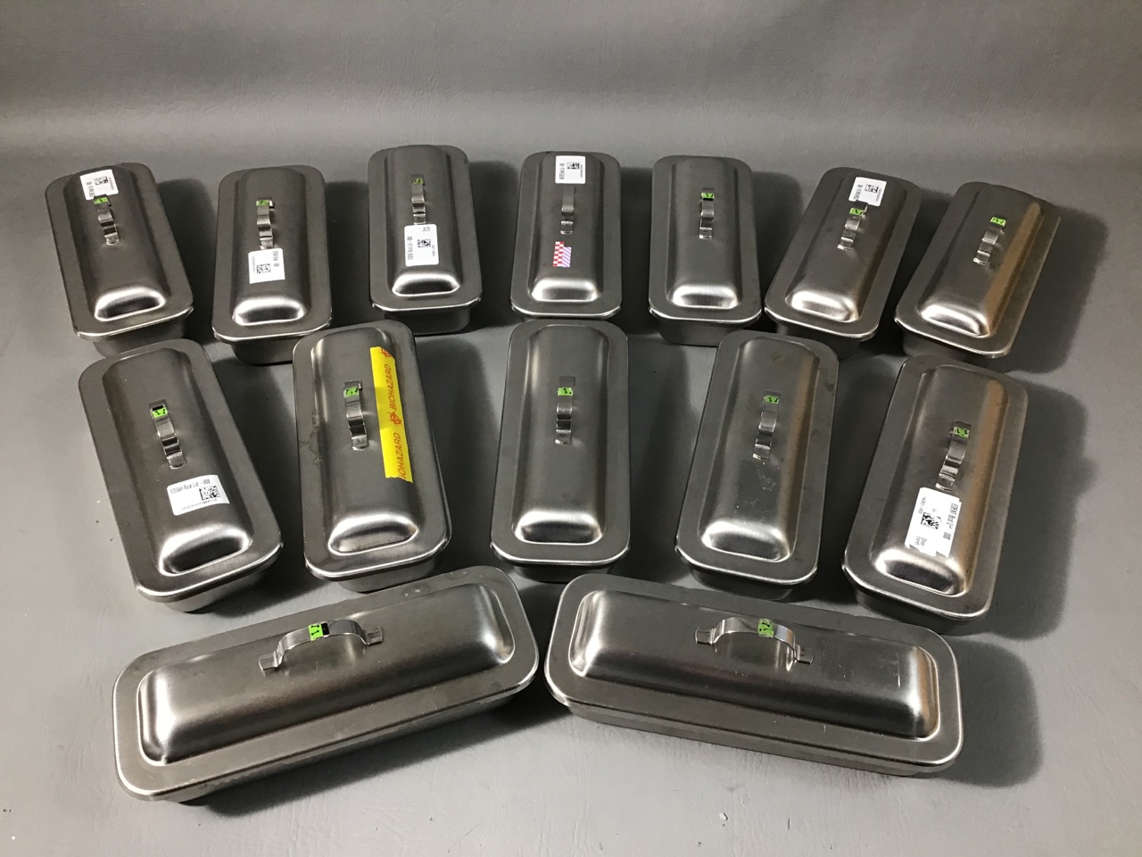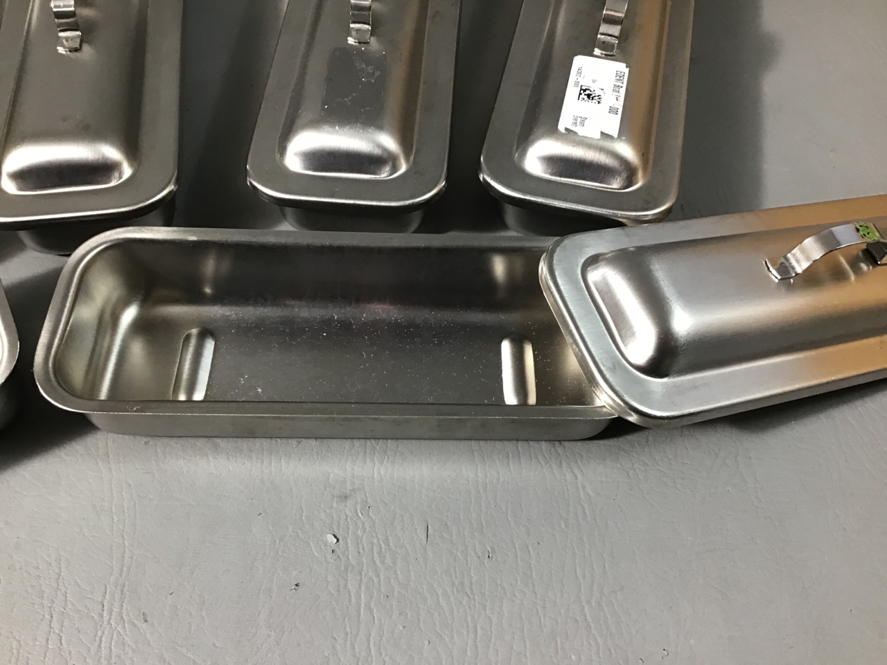 - Stainless Steel Tray with Lid: Lot of 14 Height: 2 inches Width: 3.5 inches Length: 9 inches Weight: 1 lbs