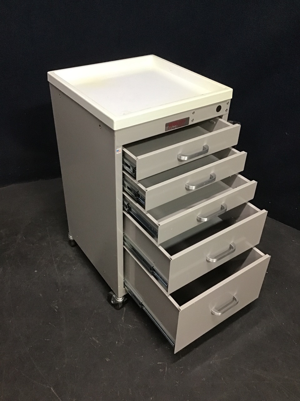 - 5 Drawer Crash Cart: Height: 33.5 inches Width: 18 inches Length: 19 inches Weight: 77 lbs