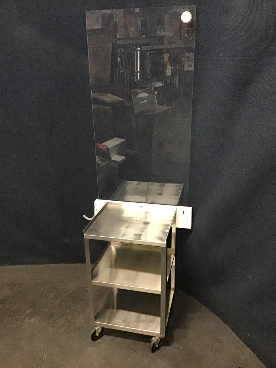 - 3 Shelf Stainless Cart: Modified with plexiglass shield for patient sign in. Height: 30 inches Width: 19 inches Length: 17 inches Weight: 17 lbs