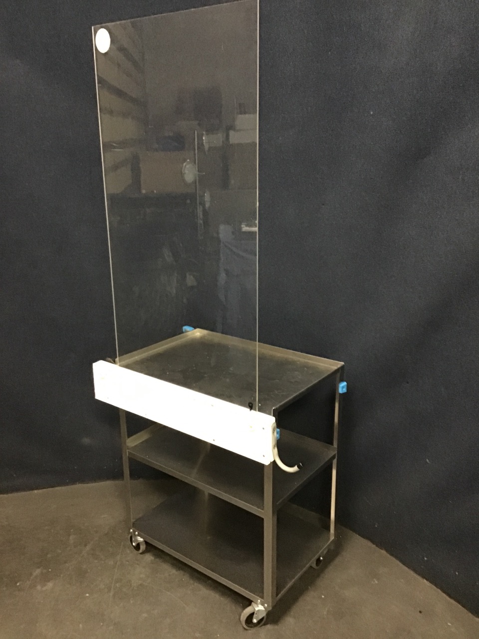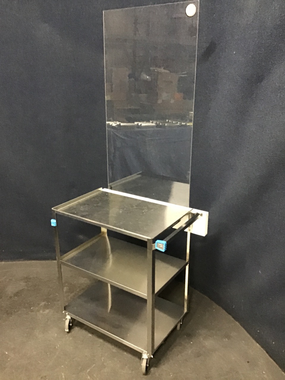 - 3 Shelf Stainless Cart: Modified with plexiglass shield for patient sign in. Height: 32 inches Width: 27 inches Length: 17 inches Weight: 20 lbs