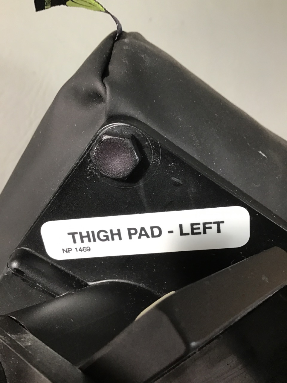 - Left Thigh Pad: Height: 7 inches Width: 5 inches Length: 8 inches Weight: 2 lbs